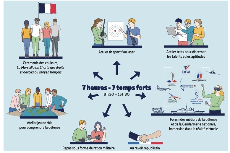 La nouvelle Journée défense et citoyenneté Suspendu en 1997, le service militaire a été remplacé par la Journée défense et citoyenneté (JDC), obligatoire pour les jeunes Français de 16 à 25 ans. Elle fait découvrir l’univers militaire et renforce l’esprit civique. Chaque année, environ 800 000 jeunes y participent, répartis sur 20 000 sessions en 2024. Une nouvelle version est déployée en métropole dès septembre 2025 et le sera en outre-mer en janvier 2026. Plus interactive, elle proposera des ateliers immersifs : tir sportif laser, tests d’aptitudes, jeu de rôle sur la défense, repas militaire, forum des métiers et immersion en réalité virtuelle. En 2026, jusqu’à 8 500 Journées Défense et Citoyenneté Nouvelle génération devraient réunir 100 jeunes par session, encadrés par dix militaires et soutenus par 1 000 réservistes recrutés d’ici 2028.